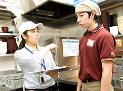 店舗で働くクルーにも手洗い、身だしなみ、健康管理にいたるまで、基本からていねいに指導して安全に努めています。