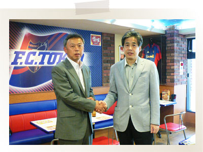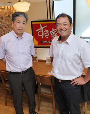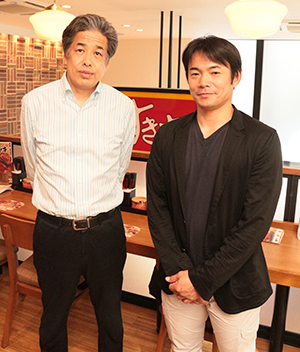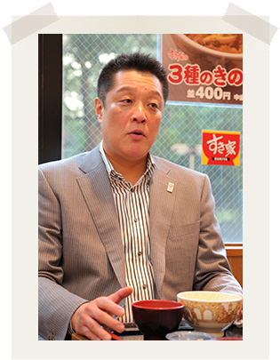今回はFC東京のクラブカラーである青赤で彩られたすき家飛田給店で、「うな牛」を召し上がりながらの対談です。