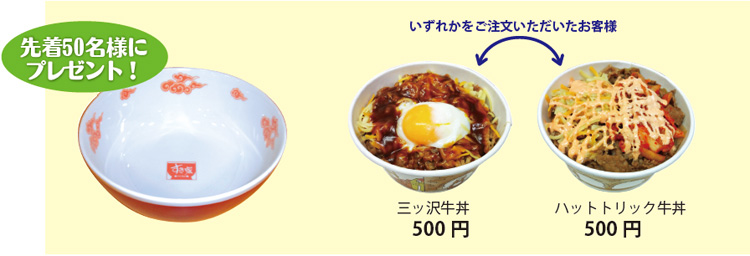| ■プレゼントについて | : | 『三ツ沢牛丼』もしくは『ハットトリック牛丼』をひとつ購入のお客様に対して、 先着50名様にらーめん丼をおひとつプレゼント致します。 ※プレゼントが無くなった場合の告知は致しません |