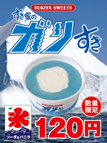 すき家では、7月3日(火)より発売のプリン、杏仁豆腐、バニラアイスクリームの3品に加え、暑い夏にぴったりの「ガリすき」をご用意し「SUKIYA SWEETS」として販売します。「ガリすき」は、ソーダ味のかき氷とバニラアイスを組み合わせた、さっぱりとした味わいと氷の冷たい食感が楽しめるスイーツです。