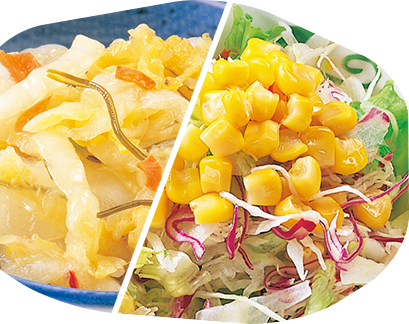 キャベツ、紫キャベツ、レタス、それぞれの切り方を工夫して食感よく、ボリュームのあるサラダに仕上げています。