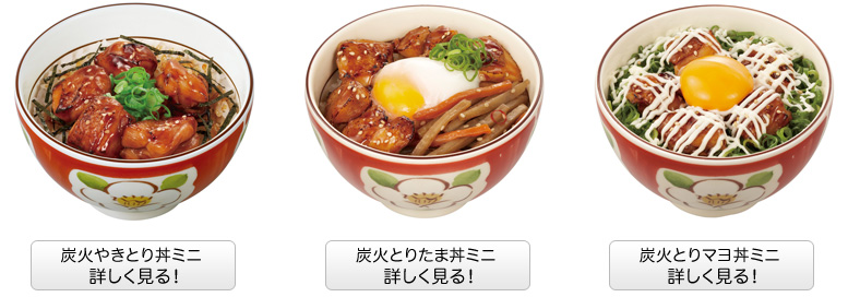 『炭火やきとり丼ミニ』、『炭火とりたま丼ミニ』、『炭火とりマヨ丼ミニ』の3種類。