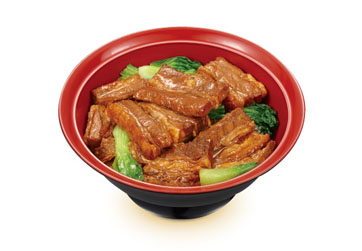 「牛トロ丼」は、醤油ベースの甘辛ダレを絡めたやわらかな厚切り牛バラ肉と、歯ごたえのいいチンゲン菜をご飯の上にのせたぜいたくな一品です。